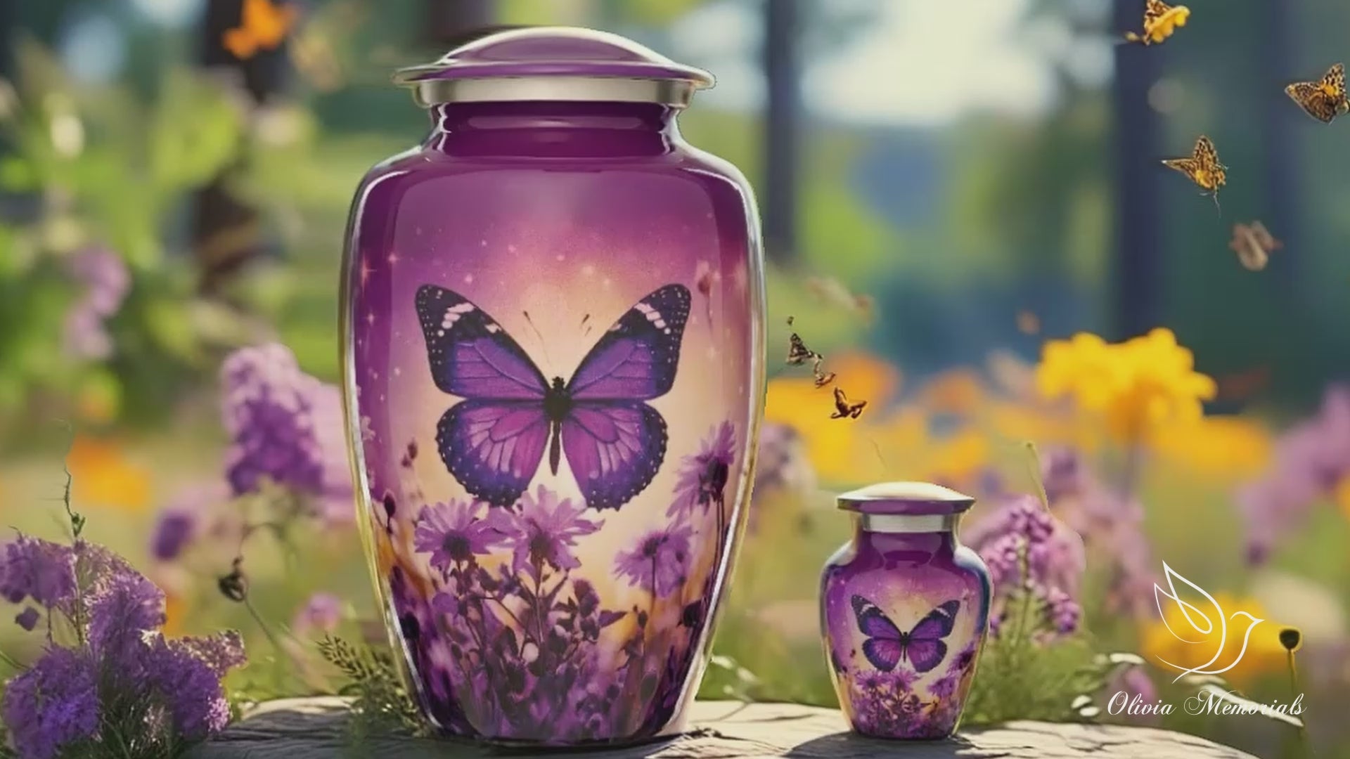 - The Craftsmanship of this purple butterfly urn will truly astound you. It features an absolutely beautiful butterfly design. Our urn features a continuous design with no seam in the back. This wonderful piece of art will preserve your precious memories perfectly for the ages. Our urns come with a top opening setting secured with a threaded lid and a felt bottom. The top of the lid matches the body of the urn itself, completing the look. Protected by a gloss coat, this urn is classic and timeless.